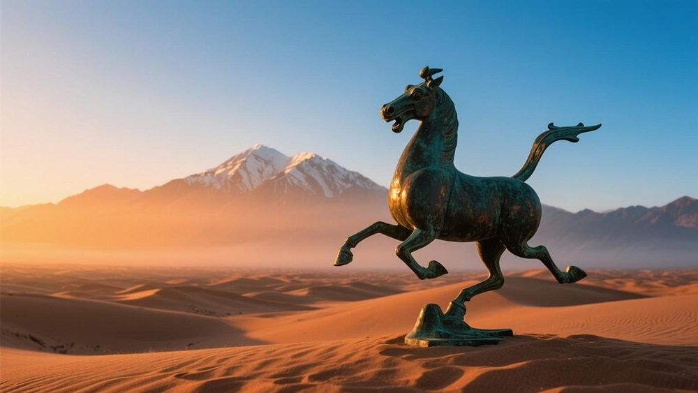 1969年出土于甘肅武威雷臺(tái)漢墓的馬踏飛燕,其矯健的凌空飛騰、疾速奔跑的雄姿,展現(xiàn)了古代工匠的卓越技藝,是中國(guó)古代雕塑藝術(shù)的巔峰之作,更是中國(guó)旅游標(biāo)志。